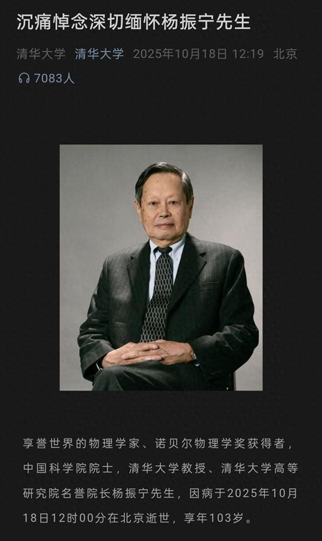 2025年10月18日,享誉世界的物理学家、诺贝尔物理学奖获得者、中国科学院院士、清华大学教授、清华大学高等研究院名誉院长杨振宁先生逝世。极目新闻记者梳理发现,目前国内已有清华大学、北京大学、复旦大学、上海交通大学、华中科技大学、西安交通大学、中山大学、东北大学、南开大学、南京大学、东南大学、广西大学、汕头大学、新疆大学、厦门大学、山西大学等在内的至少23所高校发文悼念。清华大学、西湖大学、东莞理工学院、香港中文大学等多所高校官网已变黑白。