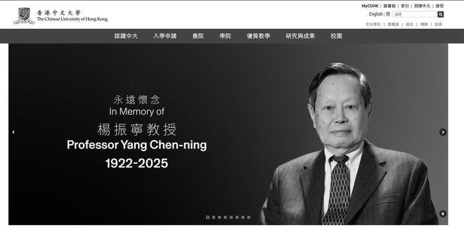 香港中文大学官网首页变黑白。官网发文称:首位华人诺贝尔奖得主、香港中文大学(中大)博文讲座教授兼理论物理研究所所长杨振宁教授,于2025年10月18日离世,享年103岁。中大师生对杨教授去世感到十分哀伤,并向杨教授的家人致以深切慰问。