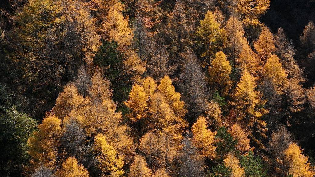 位于六盘山西麓的宁夏固原市西吉县大寨山林场秋景(无人机照片)。新华社记者 杨植森 摄